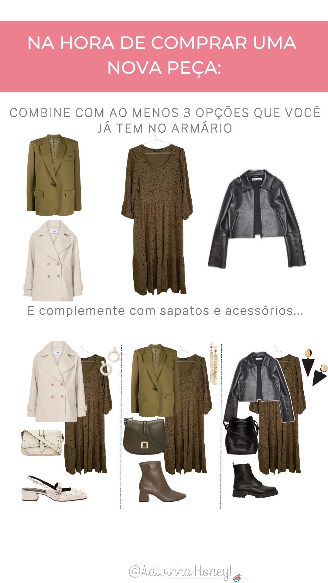 Nos últimos dias estava procurando por um vestido que pudesse usar nessa transição de estação. Encontrei essa opção midi, num tom oliva com poa. A manguinha dele é 7/8, levemente bufante e a composição é de viscose com elastano. Por si só esse vestido já veste bem, mas na hora de acertar minhas compras eu sempre avalio como a nova peça vai combinar com o meu armário. Por isso, eu tento compor o máximo possível de combinações e otimizo cada vez mais meu armário cápsula.